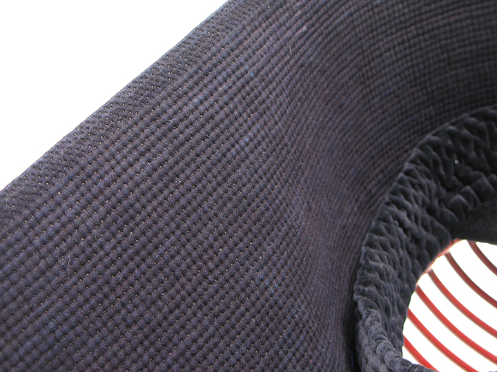 ほとんどの素材を日本製にこだわりました。 最も質感を左右するのはやはり紺反です。布団の生地ですね。これは武州正藍染め#11000の上物を使用しています。 もちろん、鹿革も日本製で、面布団(1枚革)と垂帯(1枚革)以外は小唐(チビ)を使用しています。当店で小唐と言えばおよそ30cm四方ぐらいの小さな子鹿の革の事を指します。