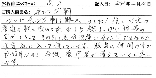 ついにチェンジ胴を購入しました!使い心地は普通の胴と変わらず、むしろ飽きっぽい性格の自分にとって、その日の気分次第でチェンジできるので大変気に入って使っています。教員の仲間の中でも好評なので、今後愛用者が増えていくと思います。