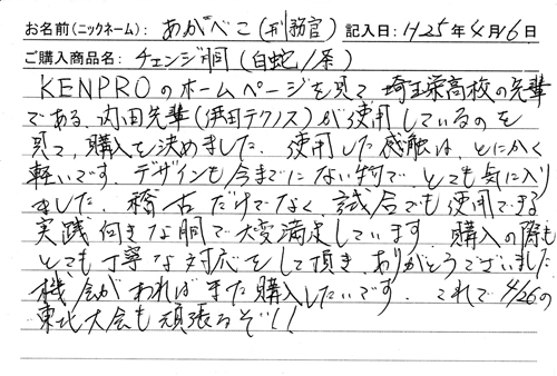KENPROのホームページを見て埼玉栄高校の先輩である、内田先輩(伊田テクノス)が使用しているのを見て、購入を決めました。使用した感触はとにかく軽いです。デザインも今までにない物で、とても気に入りました。稽古だけでなく試合でも使用できる実践向きな胴で大変満足しています。購入の際もとても丁寧な対応をして頂きありがとうございました。機会があればまた購入したいです。これで4/26の東北大会も頑張るぞ!!