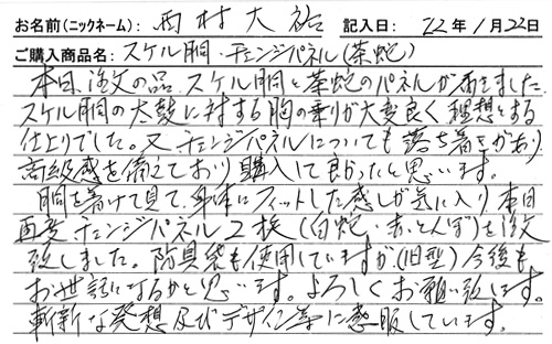 本日、注文の品チェンジ胴と茶蛇のパネルが届きました。チェンジ胴の太鼓に対する胸の乗りが大変良く理想とする仕上がりでした。又チェンジパネルについても落ち着きがあり、高級感を備えており、購入して良かったと思います。
